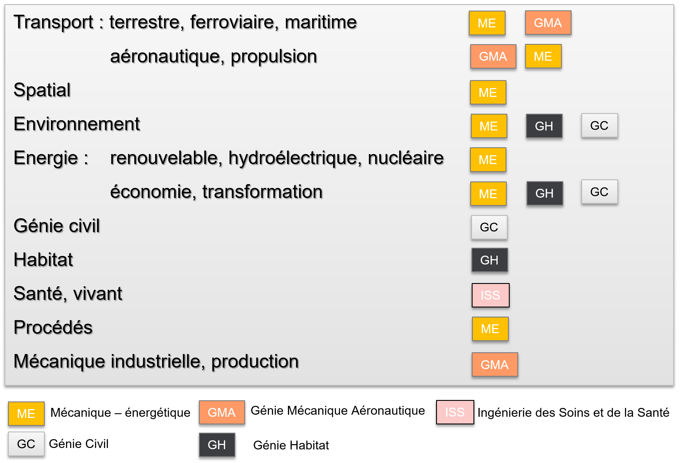 Cette filière propose des formations généralistes afin d'offrir de larges perspectives d'emplois dans différents domaines d'applications. Un équilibre est maintenu dans les formations entre les domaines scientifiques suivant: