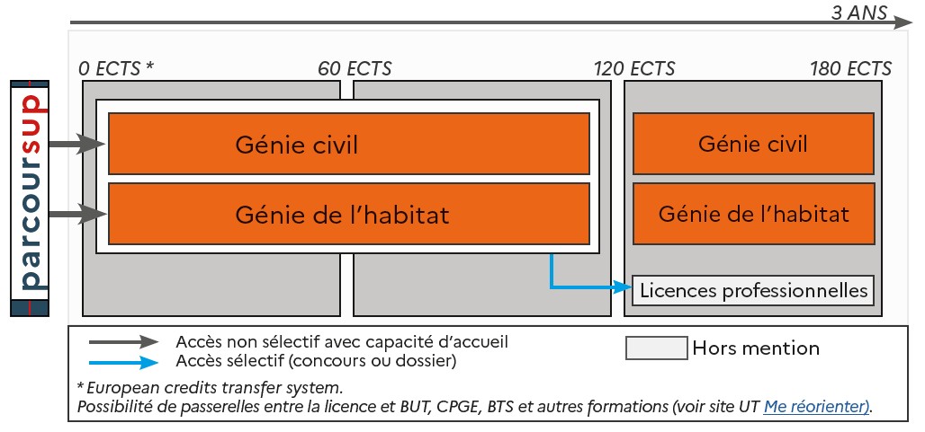 - L'accès aux parcours Génie civil et Génie de l'Habitat est également possible sur dossier pour les titulaires d'une 2e année de BUT GCCD suivant l'avis de poursuite d'étude.