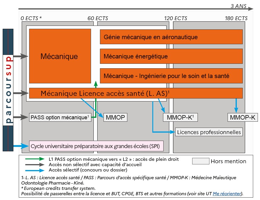 Les Licences « flexibles » s’appuient sur un ensemble d’Unités d’Enseignement (UE) obligatoires ou à choix permettant aux étudiants de s’inscrire dans un itinéraire permettant la validation de 180 ECTS (ECTS : système de crédits européens), sur une base de 60 ECTS par an. Le choix de l’itinéraire se fait en concertation étroite avec une direction des études et dépend de la formation antérieure, des orientations scientifiques et du projet professionnel de l’étudiant.- La licence mention mécanique est à accès non sélectif. Les étudiants ayant suivi les spécialités recommandées (EDS), suivent un parcours sans aménagement. S'ils ont suivi d'autres spécialités ou ayant une dossier plus faible, ils accéderont à des modules de soutien et/ou de remise à niveau.